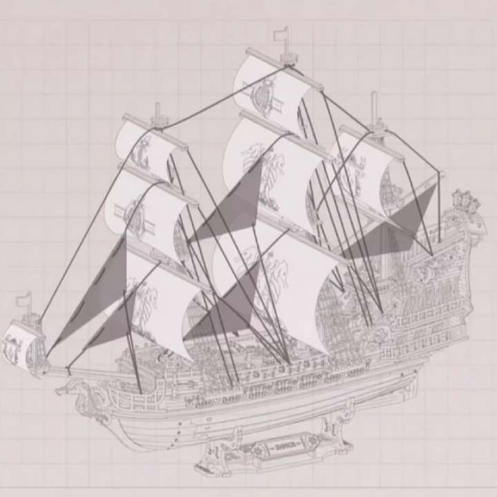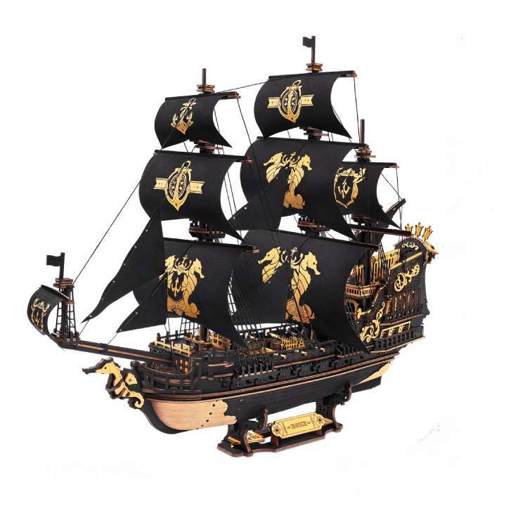 La structure à trois mâts donne un style élégant et classique, avec 13 voiles noires et or réparties entre les mâts avant, central et arrière. Ce design permet de simuler les réglages selon le vent, comme sur un vrai navire.