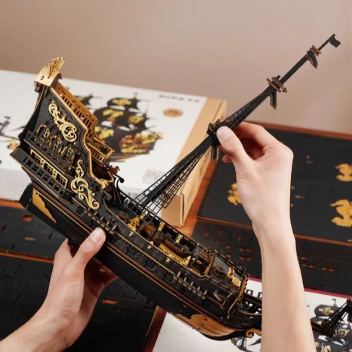 Naviguer à travers l’histoire avec la Maquette bateau pirate, une réplique en bois de 603 pièces à assembler une par une.