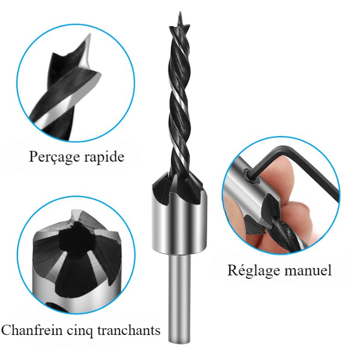 • Outil à deux fonctions : les meches a bois pour perceuse permet de percer dans le bois, en second de fraiser par-dessus des trous pour ensuite cacher les vis et poser sur celle-ci une cheville de bois.